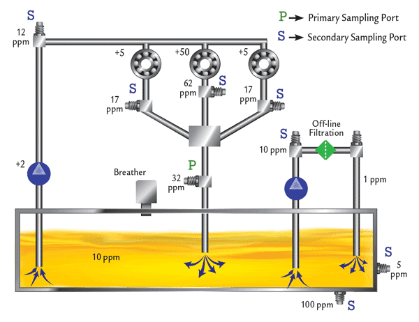 В циркуляционной системе, показанной выше [на схеме, упомянутой ранее], первичный пробоотборный порт находится на основной возвратной линии перед резервуаром. Это отличное место, так как вся система может активно контролироваться из этого единственного порта. Рассматривая схему, вы увидите вторичные пробоотборные порты после каждого компонента в системе.